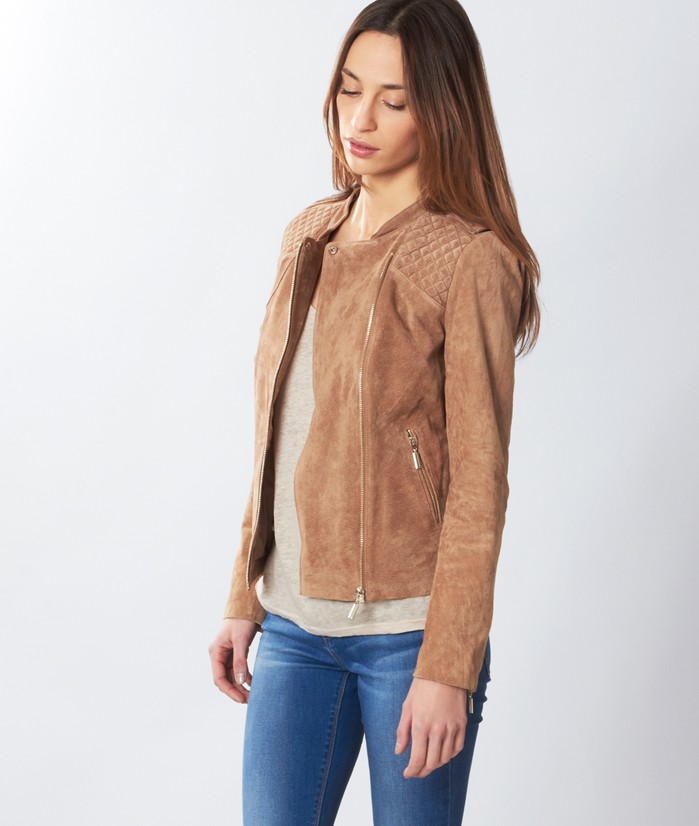 Blouson en cuir d'agneau pour femme encolure ronde avec patte pressionnée, manches longues surpiqûres fantaisies ton sur ton effet matelassé sur les épaules 2 poches zippées taille fermeture. Veste croute de cuir femme occasion. How many camels for your girlfriend? 15 blousons femme en cuir pour être tendance automne. Il arbore une bordure col en renard et les poignets également.