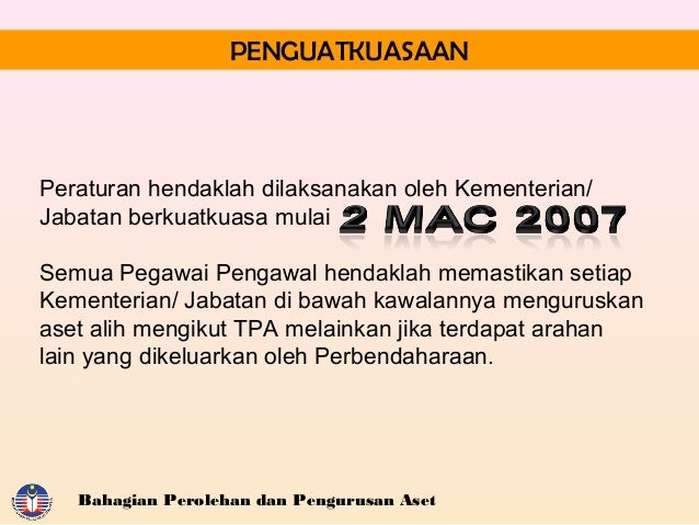 Tatacara pengurusan aset tak alih kerajaan (tpata). Seksyen pengurusan aset bahagian kawalan dan pemantauan (bkp) perbendaharaan malaysia tingkat 4, blok selatan kompleks kementerian kewangan presint 2, 62592 putrajaya. Tatacara penerimaan hadiah oleh jabatan kerajaan. 5 tahun 2007 bahagian perolehan dan pengurusan aset, kpm. Sila download tatacara pengurusan aset tak alih kerajaan klik disini. 5 tahun 2007 tatacara pengurusanaset alih kerajaan (tpa) bahagian perolehan dan pengurusan aset kementerian 5 tahun 2007 memperkemas dan memantapkanperaturan pengurusan aset alih kerajaanbahagian perolehan dan pengurusan aset 3. Panduan pemeriksaan aset alih kerajaan. Kerajaan malaysia tatacara pengurusan aset alih kerajaan. Falang translation system by faboba. Compressed archive in zip format 169.6 kb. Tatacara pengurusan aset tak alih kerajaan (tpata). Urus setia jawatankuasa pengurusan aset kerajaan 1. Tatacara pengurusan aset alih kerajaan.