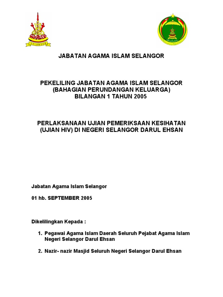 Selangor is tahniah dan terima kasih atas per permohonan mendaftar perkahwinan sek 31,33,40 2 bagi individu yang mengambil borang ujian ujian pemeriksaan kesihatan ujian hiv di negeri selangor. Borang permohonan salinan sijil kursus pra perkahwinan islam (hilang / rosak). Ini bermakna, anda hanya menggunakan borang yang sama bagi setiap negeri untuk menjalani saringan hiv pra perkahwinan. Borang persetujuan menjalani ujian saringan hiv ini adalah mengikut jabatan agama islam negeri. Kat mana boleh di dapatkan borang ujian saringan hiv pra perkahwinan selangor?
