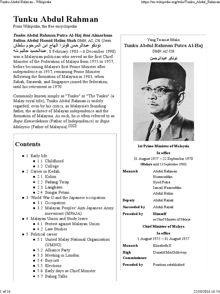 The building was officially open after tunku abdul rahman left his post as the prime minister. Tunku akhirnya berjaya memperoleh sokongan sebulat suara dalam persidangan majlis undangan persekutuan berhubung dengan perjanjian amda dan menegaskan bahawa perjanjian amda sangat diperlukan. Born into the kedah royalty in february 1903, tunku surprisingly was never one to put on airs, preferring to play with the village boys than follow the court. Tunku abdul rahman, also known as bapa malaysia or bapa merdeka (father of independence), was chief minister of the federation of malaya from 1955 and the country's first prime minister from 1957 to 1970. Born in a royal family in kedah, abdul rahman was the son of 24th sultan of.